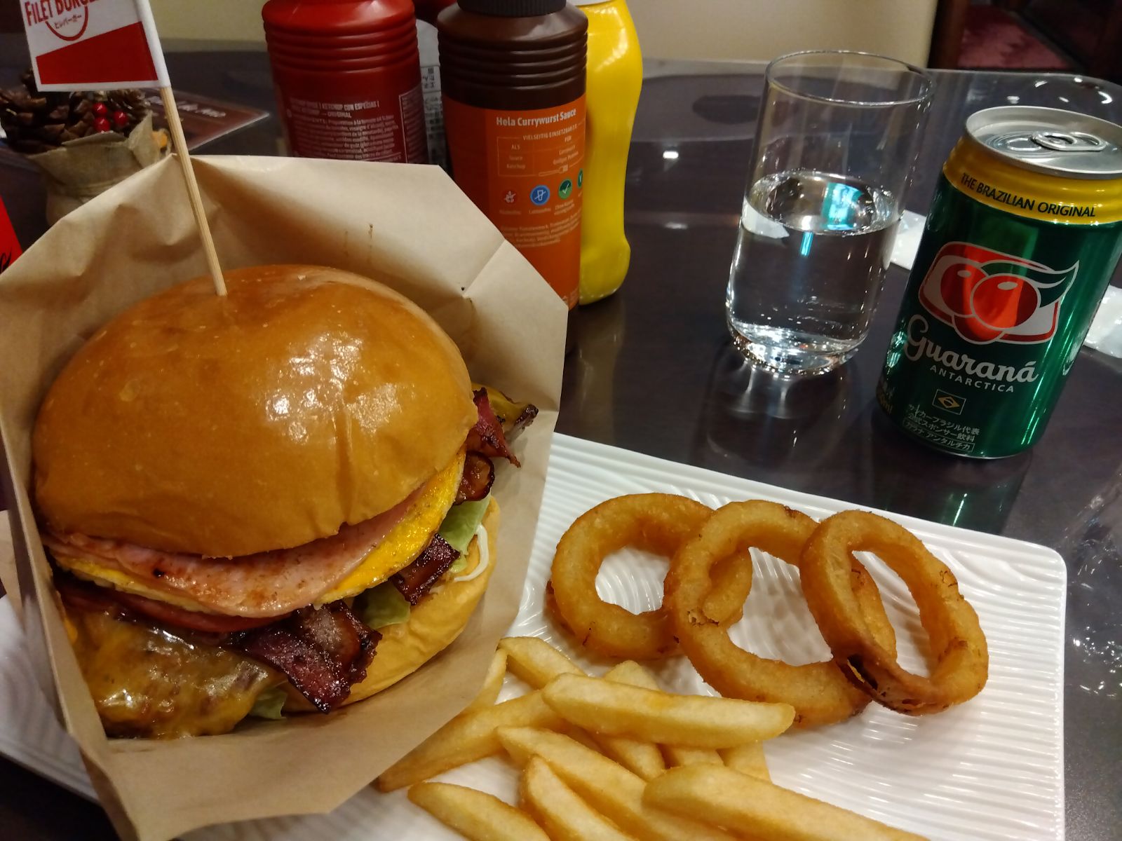 ボンヒレステーキバーガーとガラナ、オニオンフライ、ポテトを頂きました。