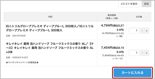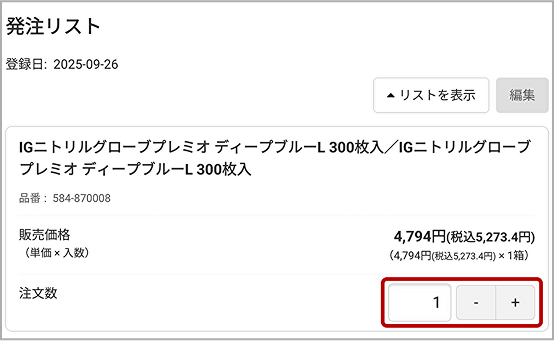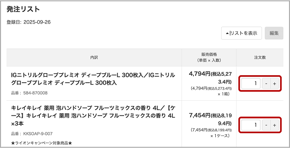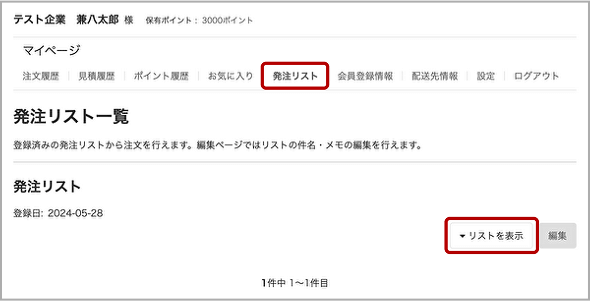 メニューから「マイページ」→「発注リスト」→「リストを表示」で、いつもご注文いただいている商品の一覧を確認できます。