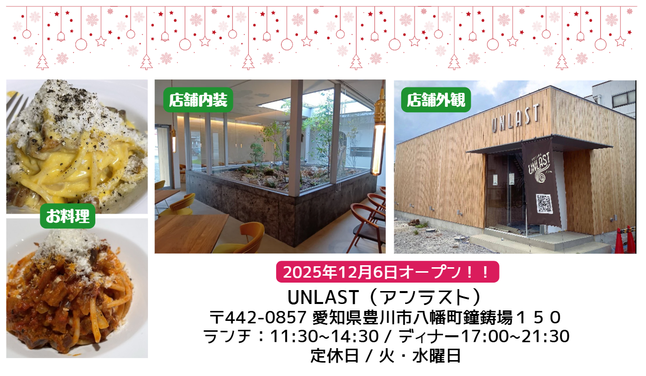 こんにちは、営業課の中神です。ガラス越しの緑と香り立つ本格イタリアン「UNLAST(アンラスト)」様が12月6日に愛知県豊川市に誕生します!