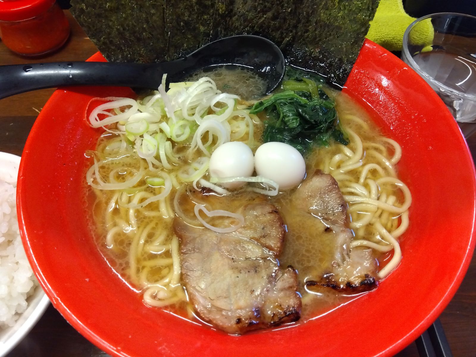 自社製法の鶏パイタンスープに醤油、味噌、塩ダレを合わせた家系ラーメンです。