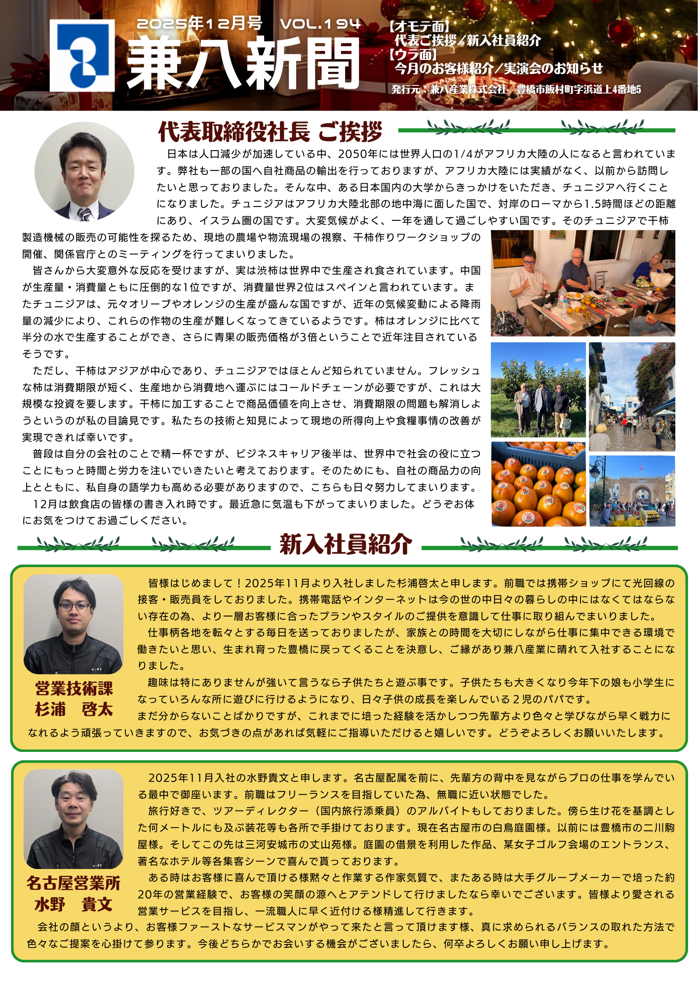 毎月お客様へお配りしております、兼八新聞を更新しました。