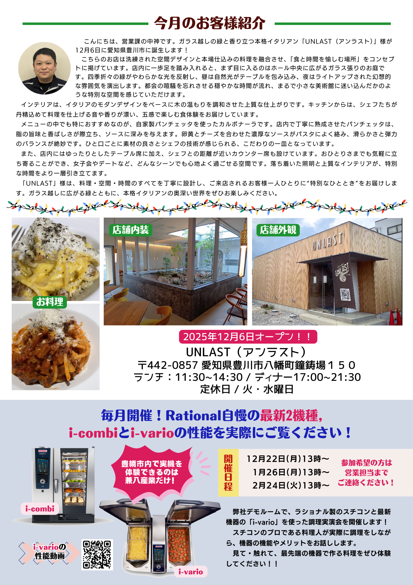 こんにちは、営業課の中神です。ガラス越しの緑と香り立つ本格イタリアン「UNLAST(アンラスト)」様が12月6日に愛知県豊川市に誕生します!