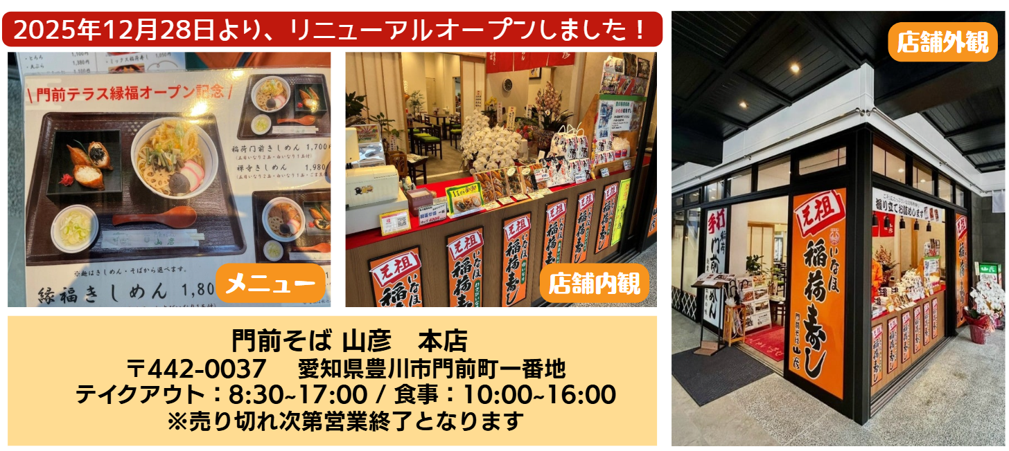 今回のリニューアルに際し、伝統を守りながらもこれまでより進化する山彦様の姿勢に、大きな刺激を受けました。豊川稲荷参拝の際は、ぜひ新しくなった山彦様へ足を運び、伝統の味と新しい空間を体感してみてください!地域に根ざした名店と共に、私たちもさらなるサービス向上に務めさせていただきます。