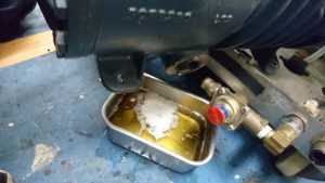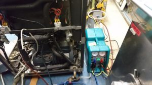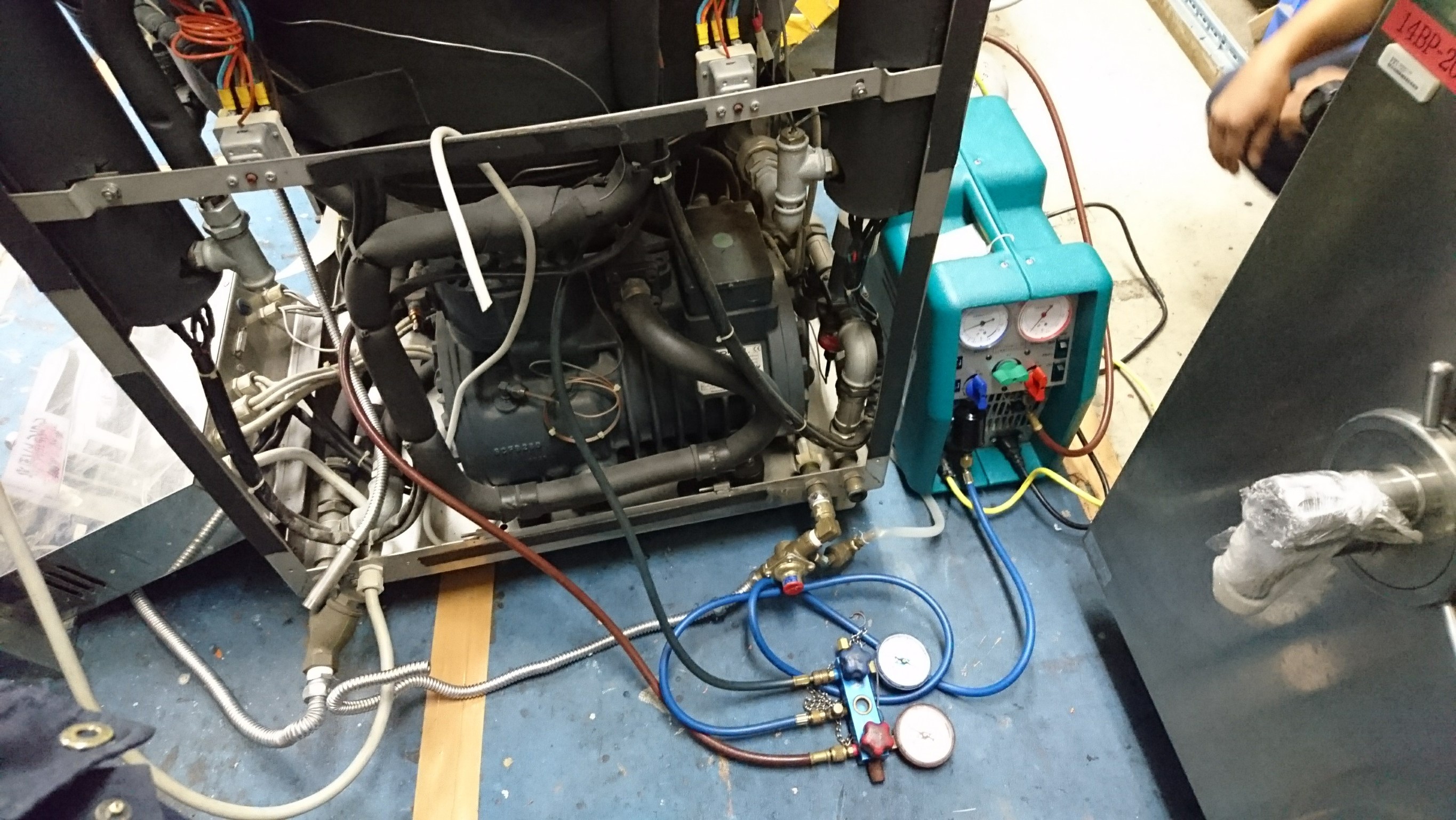 お客様の方で機器を処分することになり、中に封入されているフロンガス・コンプレッサーオイルの回収作業をしました。
