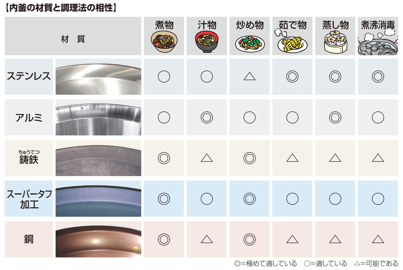 従来の鋳鉄のデメリットを補う新型鉄釜ですが、茹で物、蒸し物調理される場合には、ステンレスやアルミの内釜がより適していると言えます。