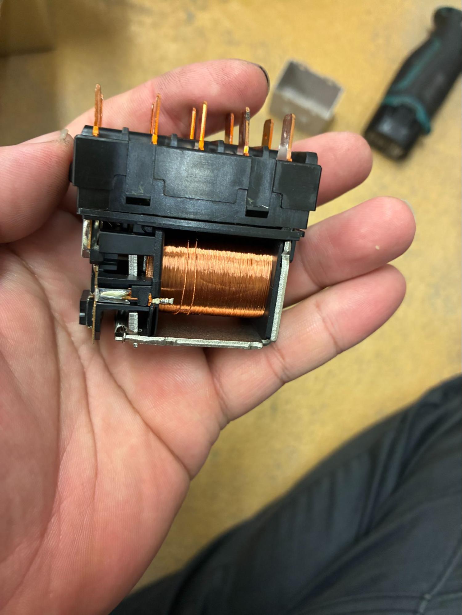 このリレーに電気は送られていたのですが、内部の接点となる部分がくっつき切れずに引っ付いたり離れたりしていました。