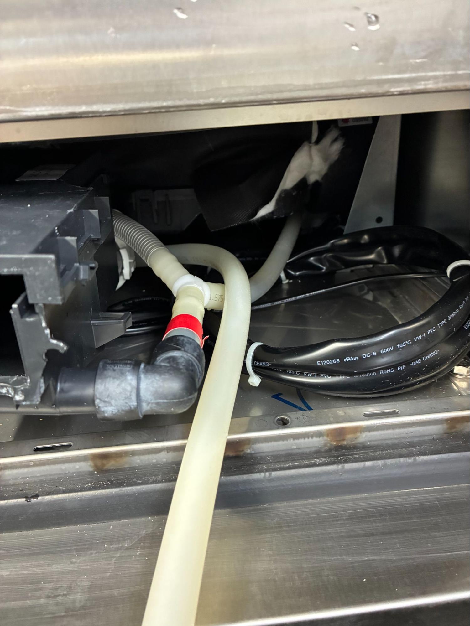 このように、どこのメーカーのスチームコンベクションオーブンでもガラスについてしまう結露だったり、庫内の余分な水を流すためだったりで底面に排水ホースが隠れています。